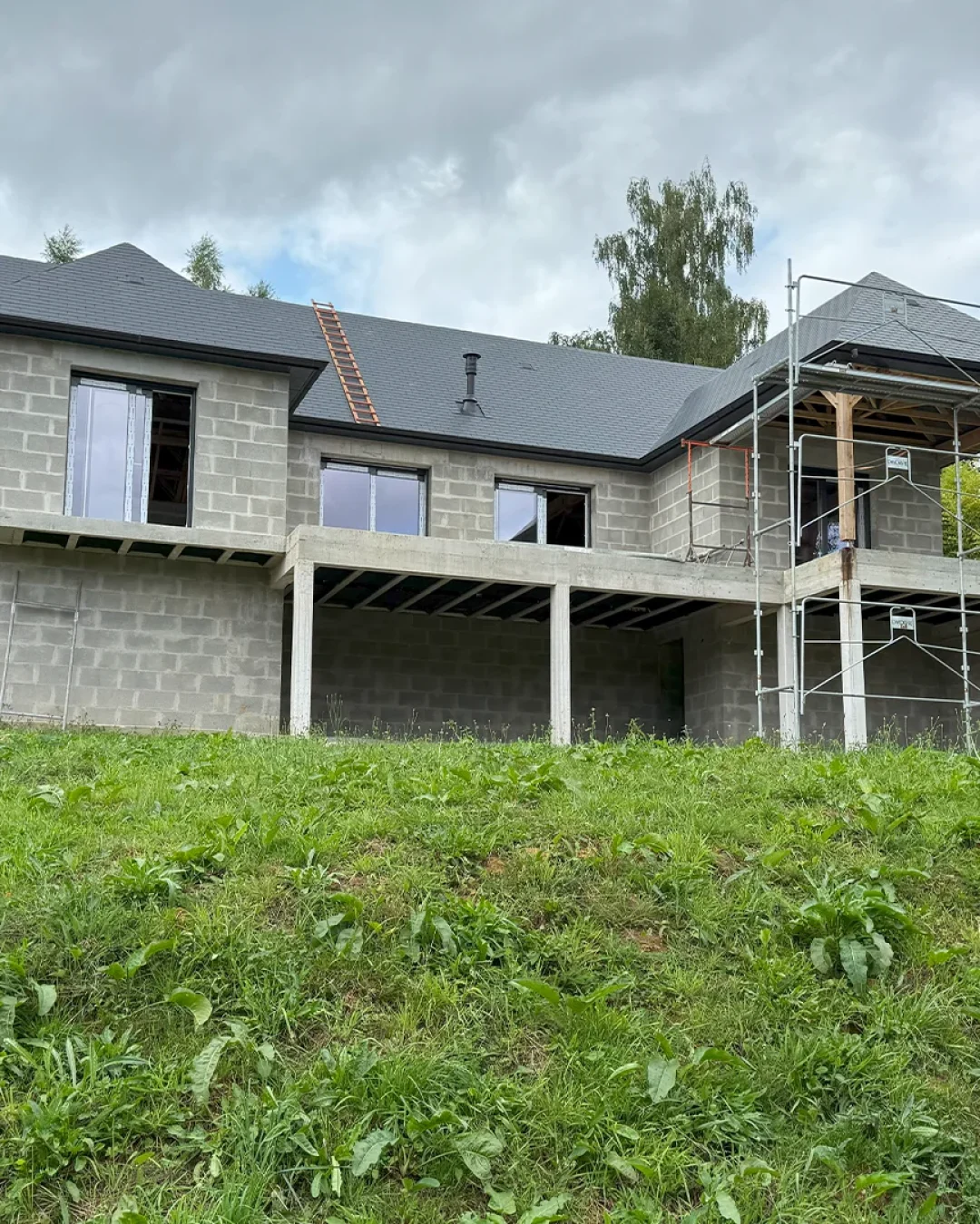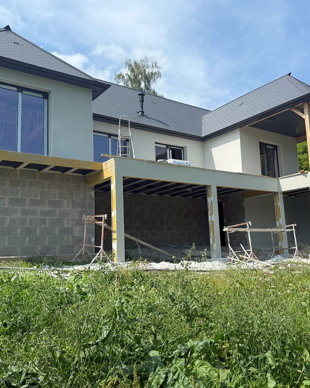 Ici, nous avons projeté un enduit gratté sur la façade et nous avons aussi pavé le sol.